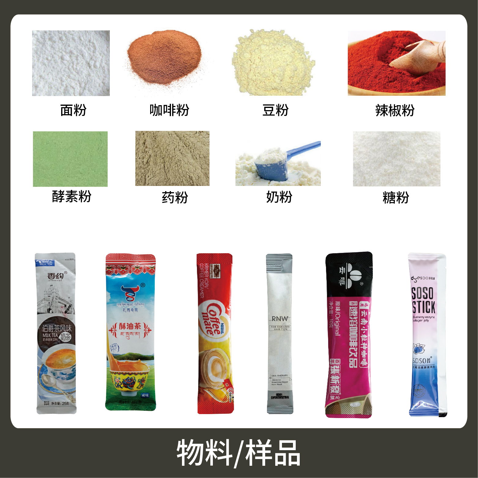 適用于食品、醫(yī)藥、化工、化妝品行業(yè)中粉劑等物品的計量包裝,如:奶粉、蛋白質粉、咖啡粉、藥粉等。